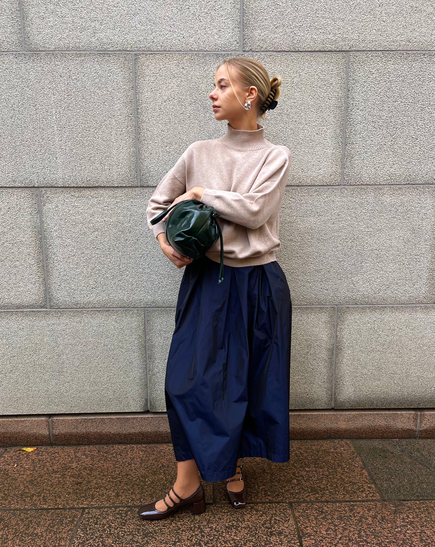 Tämä neulepaita on mukava ja tyylikäs vaatekappale, joka sopii täydellisesti viileämpään säähän. Pehmeästä villa-kashmirsekoitteesta valmistetussa neuleessa on rento beigen väri, joka on helppo valinta eri asukokonaisuuksien kanssa. Neuleessa on kohotettu pääntie, joka lisää lämpöä ja suojaa sekä luo tyylikkään ja modernin siluetin. Pitkät hihat ja hieman ylisuuri istuvuus tekevät siitä mukavan ja käytännöllisen valinnan jokapäiväiseen käyttöön. Neuleessa on myös ribbiresorit hihansuissa ja helmassa, jotka lisäävät tekstuuria ja visuaalista mielenkiintoa. Neulepaita on mukava ja tyylikäs lisä mihin tahansa syys- tai talvivaatekaappiin, tarjoten sekä lämpöä että muodikasta tyyliä.