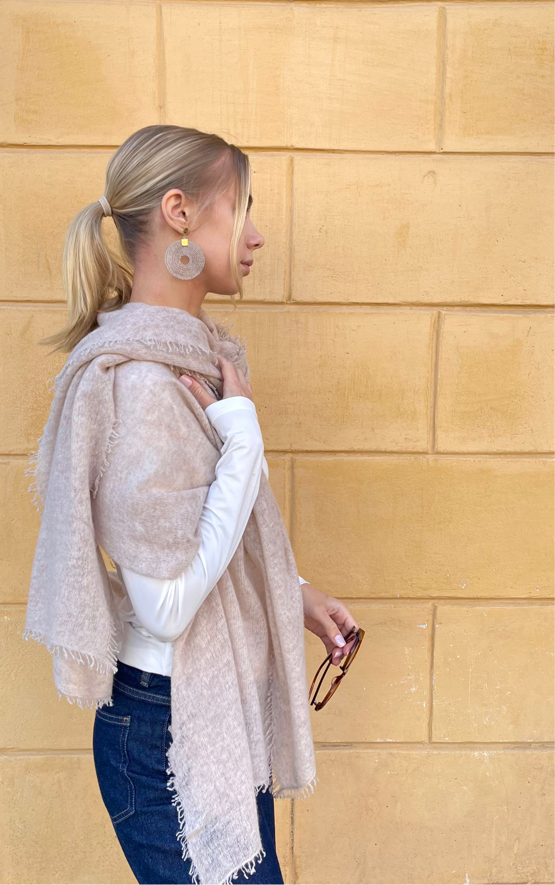 Tämä kashmir -huivi on ylellinen ja hienostunut asuste, joka on valmistettu 100 % kashmirista. Tämä huivi on uskomattoman pehmeä ja lämmin, ja se tarjoaa sekä mukavuutta että tyyliä kylmempinä kuukausina. Huivin yksinkertaisuus tekee siitä myös ajattoman kappaleen, jota voi käyttää vuodesta toiseen. Kashmir on uskomattoman pehmeää ja kevyttä, joten sitä on mukava käyttää ilman, että se tuntuu kömpelöltä tai raskaalta. Huivi on myös reilun kokoinen, mikä mahdollistaa useita stailausvaihtoehtoja, kuten sen kiertämisen kaulan ympärille, drapeerauksen hartioiden yli tai solmun sitomisen.