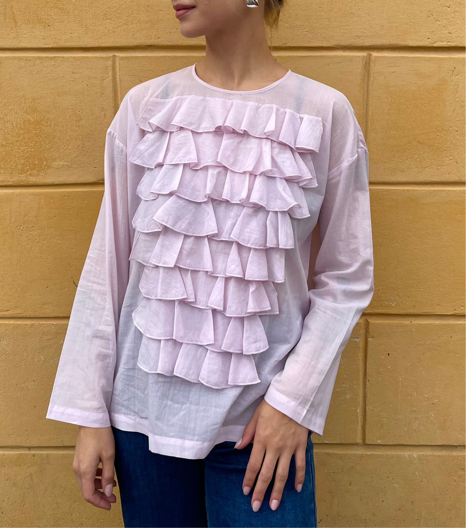 Upean näyttävä pusero, jonka etuosaa koristavat kauttaaltaan kauniit röyhelörivit. Kevyt ja läpikuultava materiaali tekee ilmeestä erityisen elegantin ja antaa puserolle ilmavan laskeutuvuuden. Tämä pusero kohottaa helposti arkihousut tyylikkääksi asuksi, ja juhlaan se on täydellinen yhdistettynä yksinkertaiseen hameeseen.