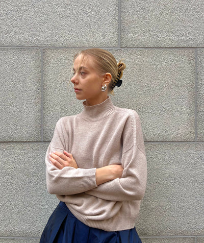This stunning camel sweater with elegant button-up sleeves is the perfect addition to your wardrobe. Pair it with a white shirt for a striking contrast. The soft and lightweight sweater is made from a luxurious Italian yarn that combines wool and cashmere. The stand-up collar and loose fit give it a casual elegance. This high-quality sweater is designed to last. More a touch of luxury to every outfit.