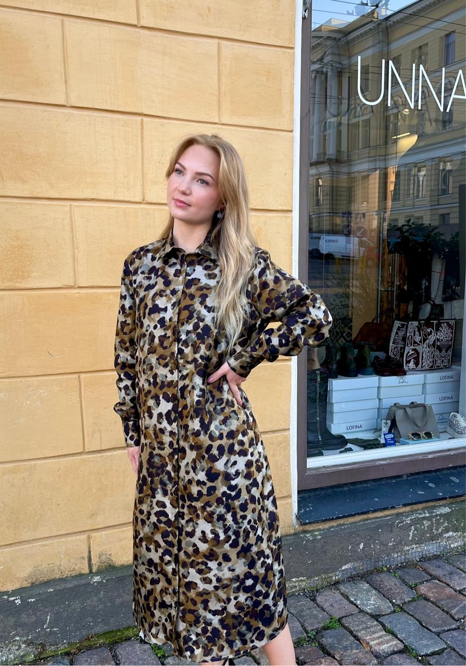 Upea leopardikuvioinen silkkinen paitamekko on ylellistä arjen luksusta. Tämä tyylikäs mekko on valmistettu korkealaatuisesta italialaisesta silkkikankaasta, joka laskeutuu kauniisti luoden imartelevan siluetin. Mekon rento istuvuus tekee siitä monipuolisesti käytettävän joko napitettuna vyön kanssa tai ilman vyötä tai pitkän jakun tapaan auki. Leopardikuvio antaa klassisen elegantille mekolle särmikästä kontrastia.